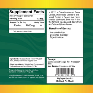 Boost your immune system and detoxify your body with Essiac Formula 2OZ Powder. This powerful herbal blend, introduced in 1922 by Canadian nurse Rene Caisse, has a rich history rooted in Native American wisdom. Inspired by an Ojibwa healer's formula, Essiac combines the natural benefits of burdock root, turkey rhubarb root, sheep sorrel, and slippery elm.